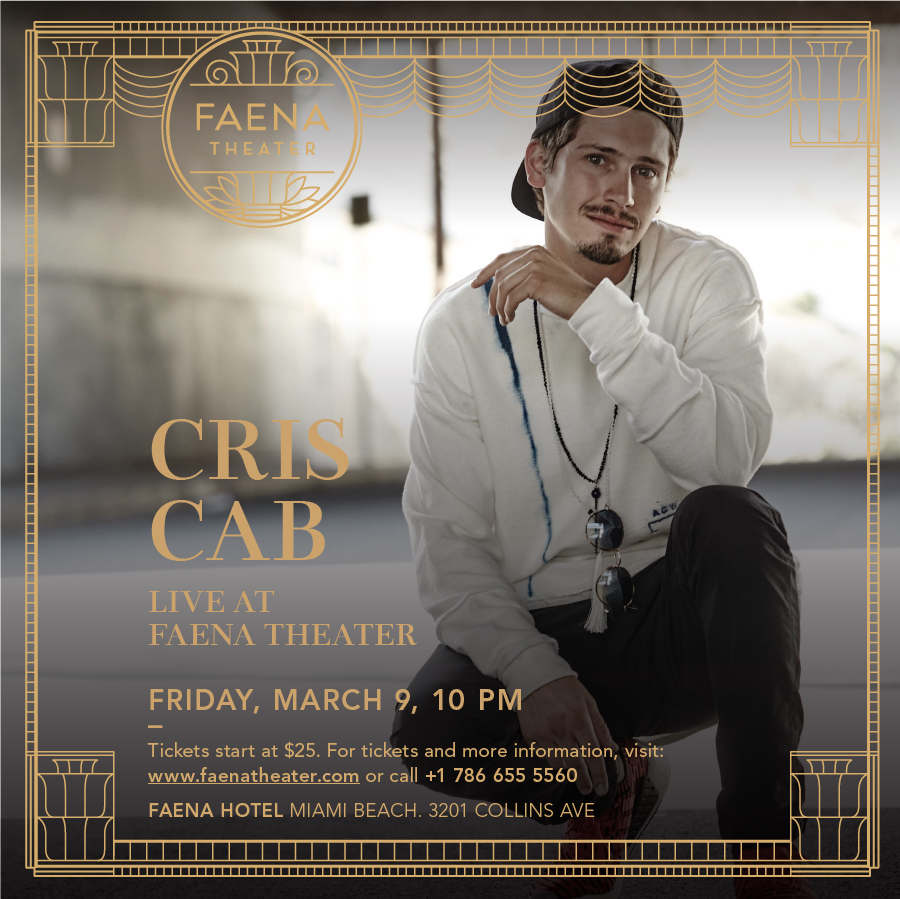 Miami’s own Cris Cab brings his unique blend of reggae, soul and pop to Faena Miami Beach for an unforgettable performance on Friday, March 9 at 10:00 p.m. the grand Faena Theater. Known for his infectious hits like “Liar Liar” and “Colors,” Cris Cab and his dance-worthy rock and reggae-inspired works have captivated millions worldwide both on stage and online. A mentee of Pharrell Williams, the award-winning artist has worked alongside some of music’s biggest names, including Big Sean, Mike Posner, Wyclef Jean, Pitbull, B.o.B. and J. Balvin, while energetic performances at major music festivals and worldwide tours have quickly propelled him into the international limelight. At just 25 years old, this Florida native is well on his way to becoming pop’s next big thing – and he’s just getting started. Tickets begin at $25 and are available at www.faenatheater.com and Ticketmaster. For more information, visit www.faenatheater.com or call +1 786 655 5742.